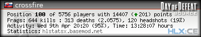 | Rank | Server | Kills | % | Ratio | Deaths | K:D | Headshots | Percentage of Headshots | % | HS:K |