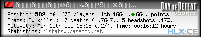 | Rank | Server | Kills | % | Ratio | Deaths | K:D | Headshots | Percentage of Headshots | % | HS:K |