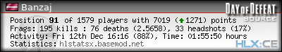 | Rank | Server | Kills | % | Ratio | Deaths | K:D | Headshots | Percentage of Headshots | % | HS:K |