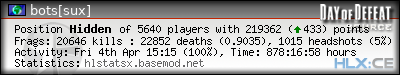| Rank | Server | Kills | % | Ratio | Deaths | K:D | Headshots | Percentage of Headshots | % | HS:K |