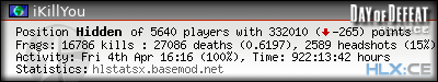 | Rank | Server | Kills | % | Ratio | Deaths | K:D | Headshots | Percentage of Headshots | % | HS:K |