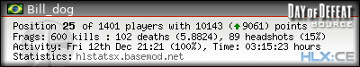 | Rank | Server | Kills | % | Ratio | Deaths | K:D | Headshots | Percentage of Headshots | % | HS:K |