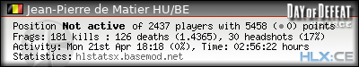 Rank | Server | Kills | % | Ratio | Deaths | K:D | Headshots | Percentage of Headshots | % | HS:K |