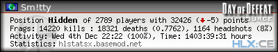 | Rank | Server | Kills | % | Ratio | Deaths | K:D | Headshots | Percentage of Headshots | % | HS:K |