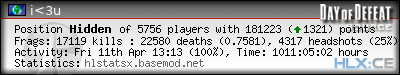 | Rank | Server | Kills | % | Ratio | Deaths | K:D | Headshots | Percentage of Headshots | % | HS:K |