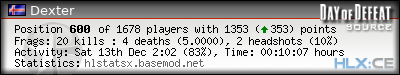 | Rank | Server | Kills | % | Ratio | Deaths | K:D | Headshots | Percentage of Headshots | % | HS:K |