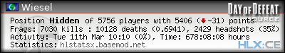 | Rank | Victim | Kills | % | Ratio | Deaths | % | Ratio | K:D | Headshots | % | Ratio | HS:K |