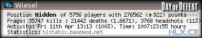 | Rank | Server | Kills | % | Ratio | Deaths | K:D | Headshots | Percentage of Headshots | % | HS:K |