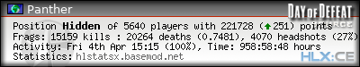 | Rank | Server | Kills | % | Ratio | Deaths | K:D | Headshots | Percentage of Headshots | % | HS:K |