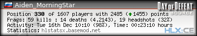 | Rank | Server | Kills | % | Ratio | Deaths | K:D | Headshots | Percentage of Headshots | % | HS:K |