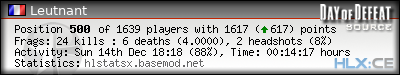 | Rank | Server | Kills | % | Ratio | Deaths | K:D | Headshots | Percentage of Headshots | % | HS:K |