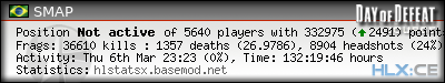 Rank | Server | Kills | % | Ratio | Deaths | K:D | Headshots | Percentage of Headshots | % | HS:K |