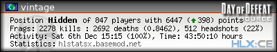 | Rank | Server | Kills | % | Ratio | Deaths | K:D | Headshots | Percentage of Headshots | % | HS:K |