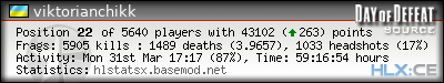 Rank | Server | Kills | % | Ratio | Deaths | K:D | Headshots | Percentage of Headshots | % | HS:K |