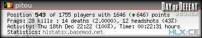 | Rank | Server | Kills | % | Ratio | Deaths | K:D | Headshots | Percentage of Headshots | % | HS:K |