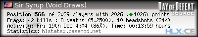 | Rank | Server | Kills | % | Ratio | Deaths | K:D | Headshots | Percentage of Headshots | % | HS:K |
