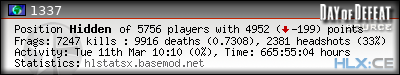 | Rank | Server | Kills | % | Ratio | Deaths | K:D | Headshots | Percentage of Headshots | % | HS:K |