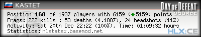 | Rank | Server | Kills | % | Ratio | Deaths | K:D | Headshots | Percentage of Headshots | % | HS:K |