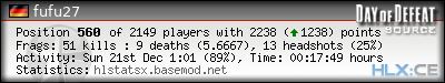 | Rank | Server | Kills | % | Ratio | Deaths | K:D | Headshots | Percentage of Headshots | % | HS:K |