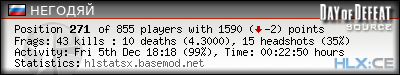 | Rank | Server | Kills | % | Ratio | Deaths | K:D | Headshots | Percentage of Headshots | % | HS:K |