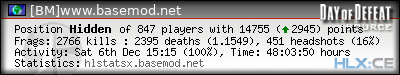 | Rank | Server | Kills | % | Ratio | Deaths | K:D | Headshots | Percentage of Headshots | % | HS:K |