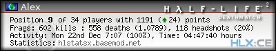 | Rank | Server | Kills | % | Ratio | Deaths | K:D | Headshots | Percentage of Headshots | % | HS:K |