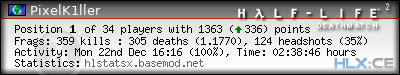 | Rank | Server | Kills | % | Ratio | Deaths | K:D | Headshots | Percentage of Headshots | % | HS:K |