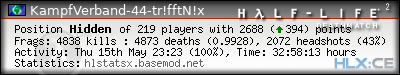 | Rank | Server | Kills | % | Ratio | Deaths | K:D | Headshots | Percentage of Headshots | % | HS:K |