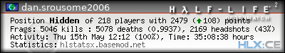 | Rank | Server | Kills | % | Ratio | Deaths | K:D | Headshots | Percentage of Headshots | % | HS:K |