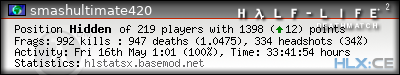 | Rank | Server | Kills | % | Ratio | Deaths | K:D | Headshots | Percentage of Headshots | % | HS:K |