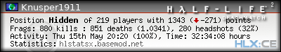 | Rank | Server | Kills | % | Ratio | Deaths | K:D | Headshots | Percentage of Headshots | % | HS:K |