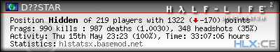 | Rank | Server | Kills | % | Ratio | Deaths | K:D | Headshots | Percentage of Headshots | % | HS:K |