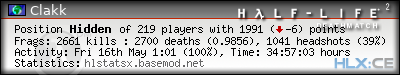 | Rank | Server | Kills | % | Ratio | Deaths | K:D | Headshots | Percentage of Headshots | % | HS:K |