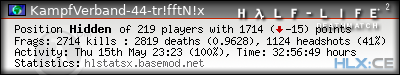 | Rank | Server | Kills | % | Ratio | Deaths | K:D | Headshots | Percentage of Headshots | % | HS:K |