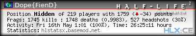 | Rank | Server | Kills | % | Ratio | Deaths | K:D | Headshots | Percentage of Headshots | % | HS:K |