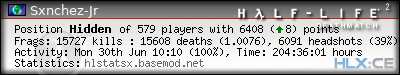| Rank | Server | Kills | % | Ratio | Deaths | K:D | Headshots | Percentage of Headshots | % | HS:K |