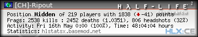 | Rank | Server | Kills | % | Ratio | Deaths | K:D | Headshots | Percentage of Headshots | % | HS:K |