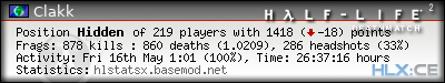 | Rank | Server | Kills | % | Ratio | Deaths | K:D | Headshots | Percentage of Headshots | % | HS:K |