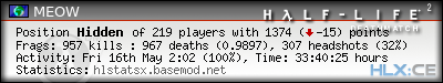 | Rank | Server | Kills | % | Ratio | Deaths | K:D | Headshots | Percentage of Headshots | % | HS:K |