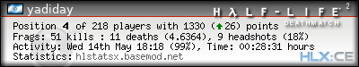 | Rank | Server | Kills | % | Ratio | Deaths | K:D | Headshots | Percentage of Headshots | % | HS:K |