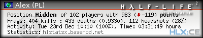 | Rank | Server | Kills | % | Ratio | Deaths | K:D | Headshots | Percentage of Headshots | % | HS:K |