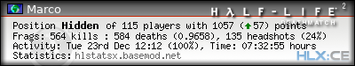 | Rank | Server | Kills | % | Ratio | Deaths | K:D | Headshots | Percentage of Headshots | % | HS:K |