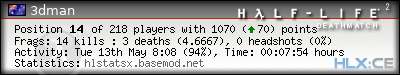 | Rank | Server | Kills | % | Ratio | Deaths | K:D | Headshots | Percentage of Headshots | % | HS:K |