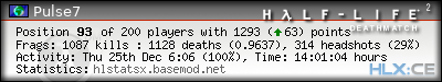 | Rank | Server | Kills | % | Ratio | Deaths | K:D | Headshots | Percentage of Headshots | % | HS:K |
