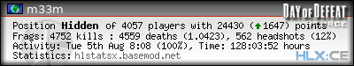| Rank | Server | Kills | % | Ratio | Deaths | K:D | Headshots | Percentage of Headshots | % | HS:K |