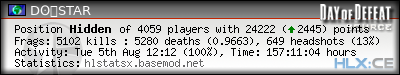 | Rank | Server | Kills | % | Ratio | Deaths | K:D | Headshots | Percentage of Headshots | % | HS:K |