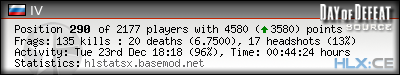 | Rank | Server | Kills | % | Ratio | Deaths | K:D | Headshots | Percentage of Headshots | % | HS:K |