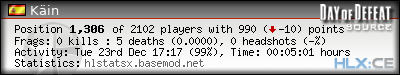 | Rank | Map | Kills | % | Ratio | Deaths | % | Ratio | K:D | Headshots | % | Ratio | HS:K |