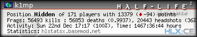 | Rank | Server | Kills | % | Ratio | Deaths | K:D | Headshots | Percentage of Headshots | % | HS:K |