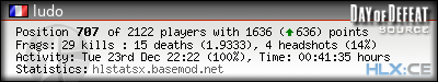 | Rank | Server | Kills | % | Ratio | Deaths | K:D | Headshots | Percentage of Headshots | % | HS:K |